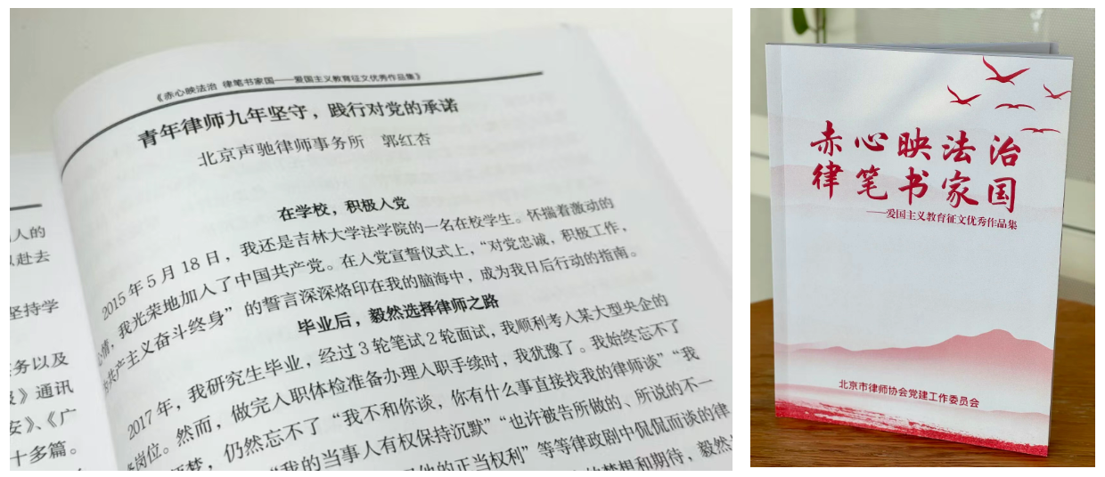 为深入学习贯彻习近平新时代中国特色社会主义思想,落实司法部党组对广大律师提出的“五点希望”,进一步加强爱国主义教育,弘扬爱国主义精神,北京市律师协会组织开展了爱国主义教育征文活动。郭红杏律师“青年律师九年坚守,践行对党的承诺”一文凭借深刻的思想内涵与真挚的执业情怀,成功入选《赤心映法治 律笔书家国 —— 爱国主义教育征文优秀作品集》,我们一同品读佳作,感受字里行间的责任与担当,汲取奋进力量。