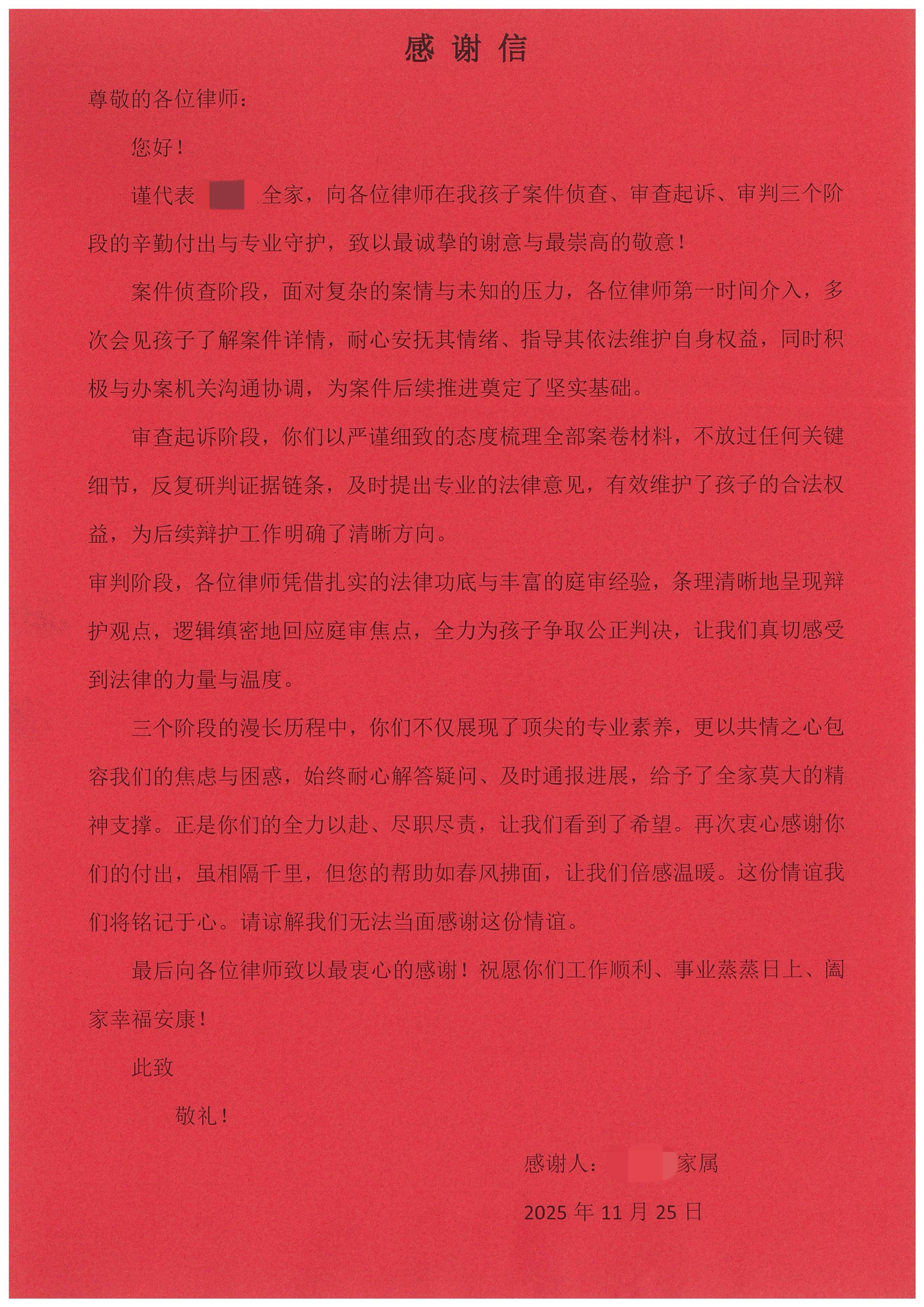 近日,我所李羽苹团队毛增泉律师代理的一起涉嫌猥亵儿童案件顺利审结。通过在侦查、审查起诉、审判三个阶段的专业辩护与不懈努力,当事人的合法权益得到有效维护,最终刑期较量刑建议有所减轻,赢得了当事人家属的高度认可。家属在收到案件结果后,向办案律师们发来了感谢信。