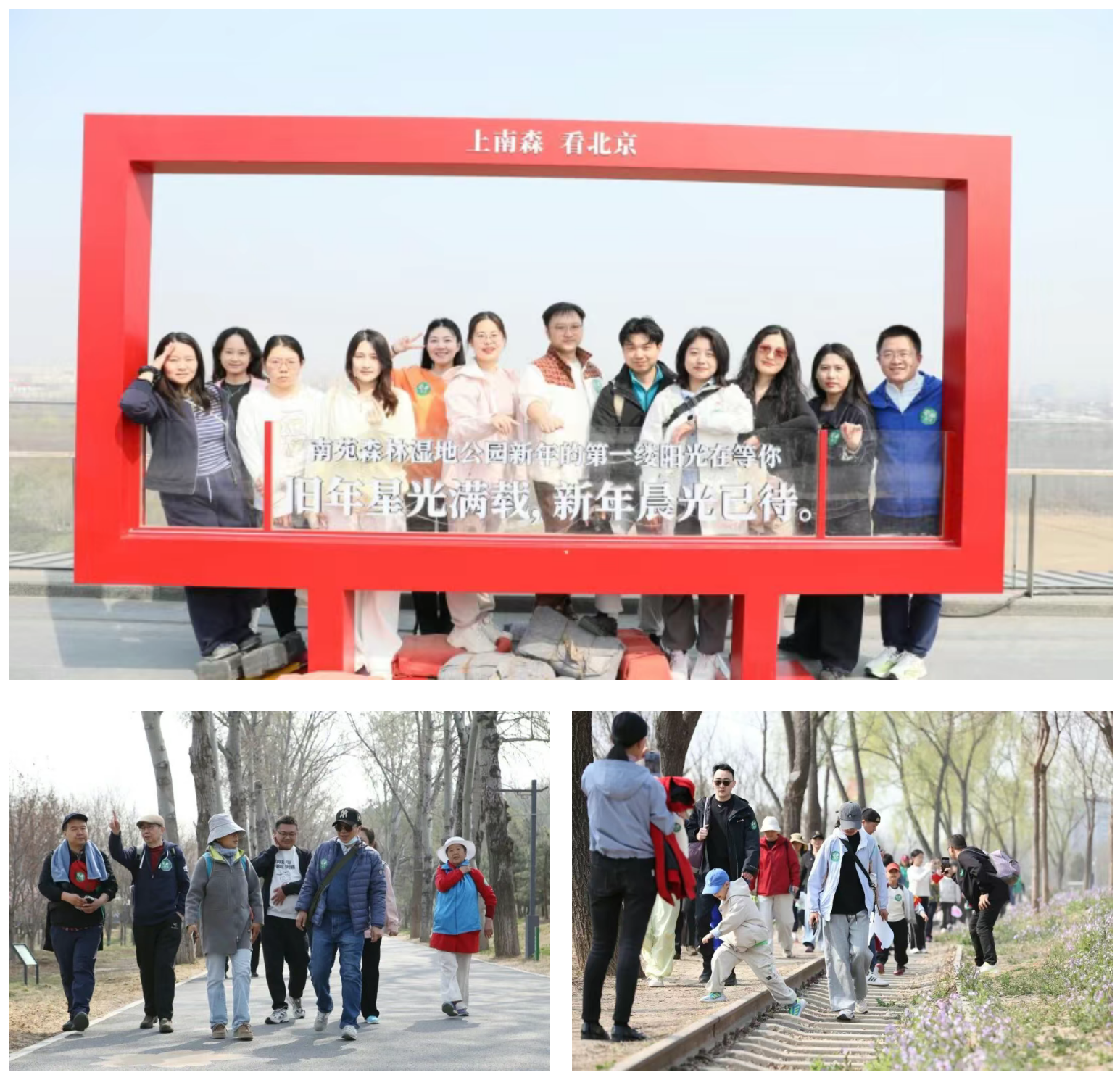 伴着春日暖阳,徒步队伍有序启程。沿湿地步道漫步,春水漾波、山桃夹道,连翘金黄满枝,玉兰清雅绽放,一路繁花相伴,风光无限。行走途中,各组领队协调节奏,志愿者全程贴心陪伴,大家一边感受自然生机,一边交流重症肌无力罕见病科普知识,倾听病友们向阳而生的生命故事,让原本普通的徒步,因善意与陪伴更具意义。行至36米高观景台,大家驻足打卡,俯瞰南苑湿地全景,将春日美好定格;途经特色铁路小站,分组完成趣味寻物任务,在花枝间拍摄创意照片,让行走充满欢声笑语。
