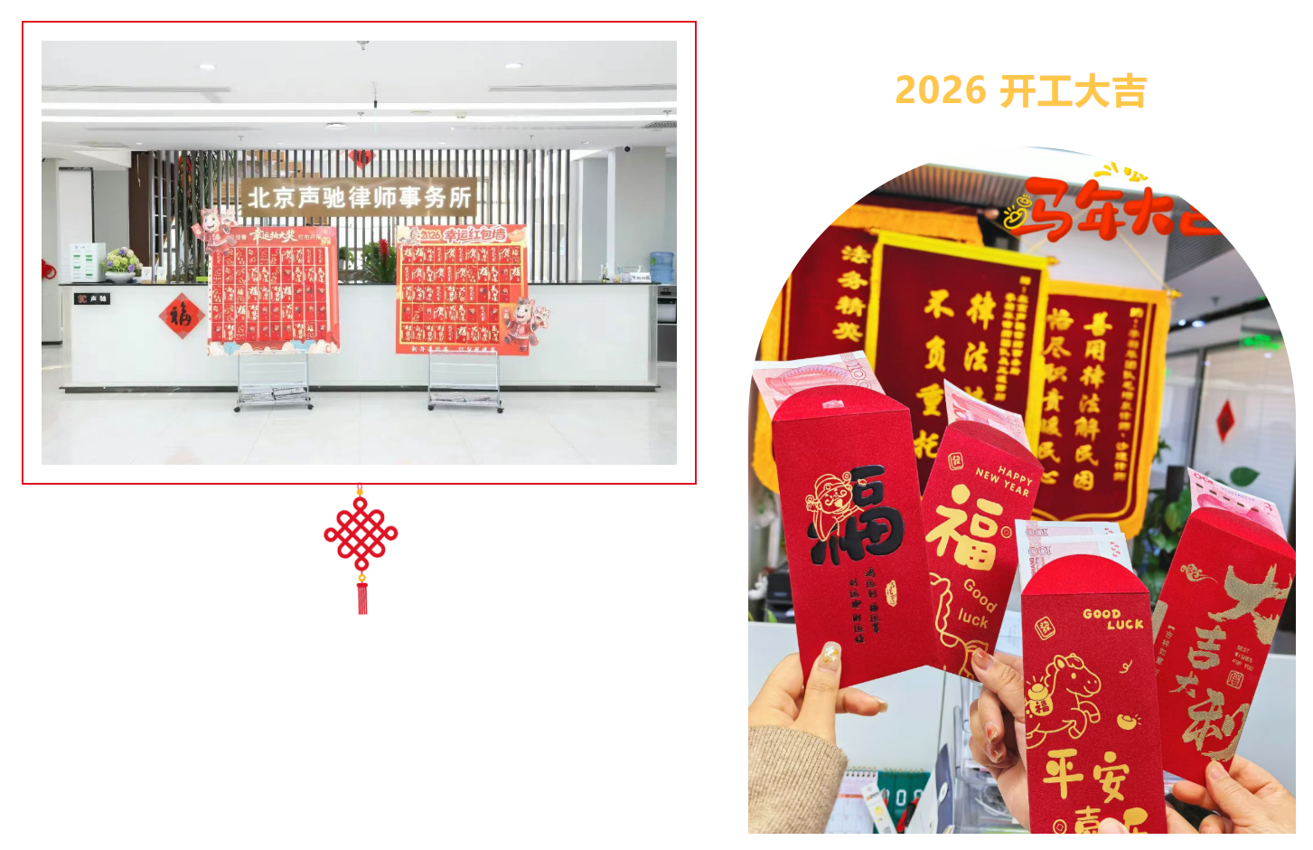站在新的起点,声驰律所将继续秉持“严谨专业、勤勉尽责、诚信尚法”服务宗旨,以更加饱满的热情、更加务实的作风,携手并肩,共赴新程。2026,开工大吉!我们共乘新春瑞气,在法律服务的道路上笃行不怠,再创佳绩!