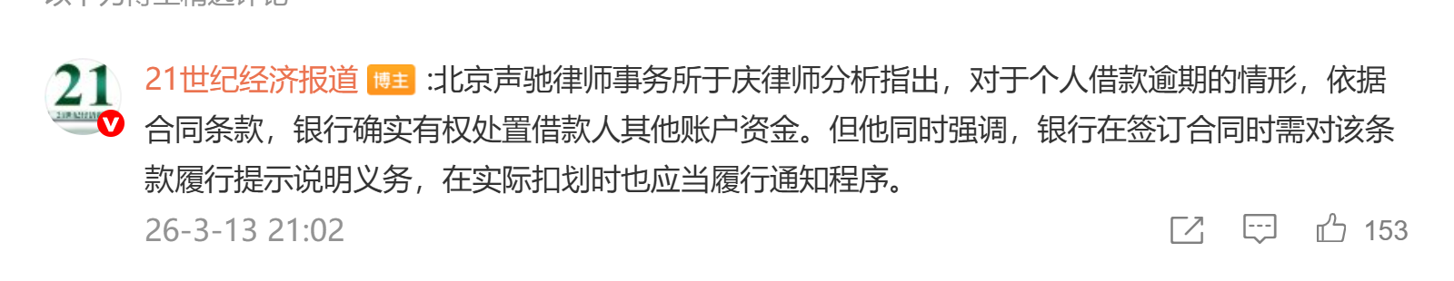 个人贷款逾期后银行直接扣划借款人其他账户资金,特别是竟连养老金账户也出现类似现象,引发广泛关注。银行扣划权的行使边界在哪?金融消费者的合法权益如何保障?近日,声驰律师事务所于庆律师就此接受21世纪经济报道记者采访,从法律专业角度进行了分析,相关报道在21世纪经济报各平台发布。